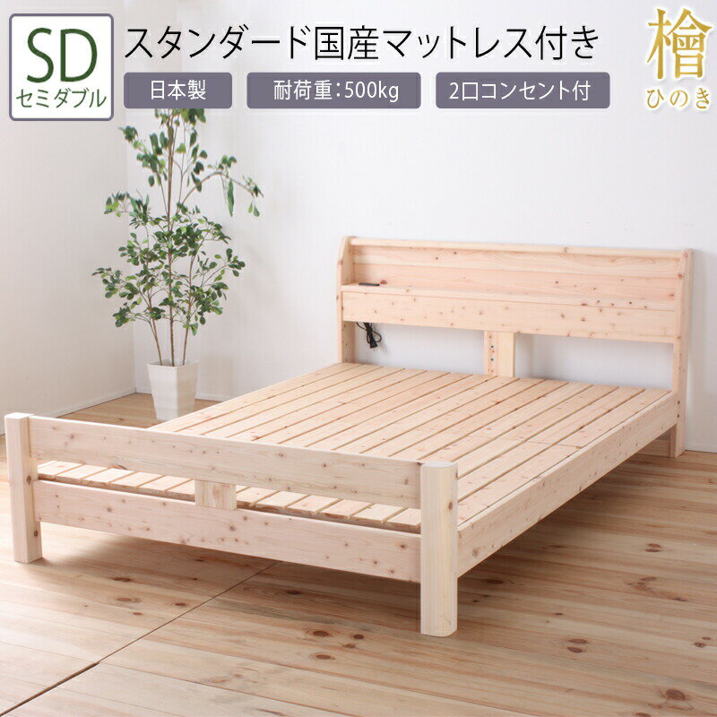 送料無料 ベッド セミダブル SD スタンダード国産マットレス付き 頑丈檜ベッド 2段階 高さ調節 棚付き コンセント付き ひのきベッド すのこ 頑丈 フロアベッド ローベッド ベッドフレーム シンプル おしゃれ