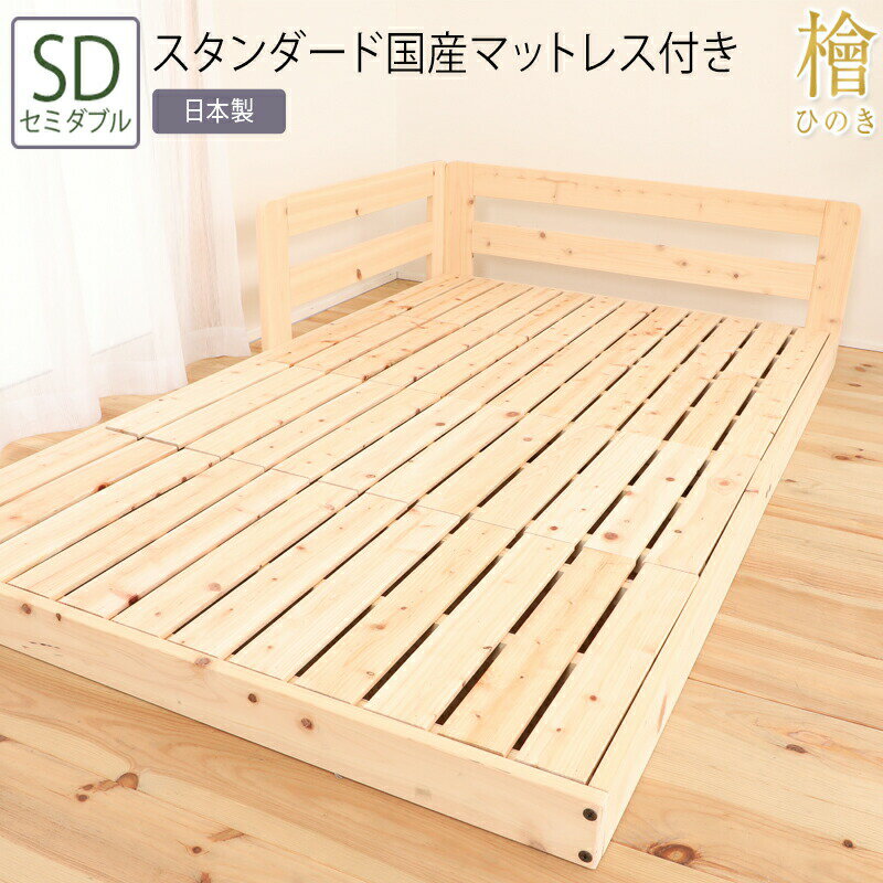 送料無料 ベッド セミダブル SD スタンダード国産マットレス付き 並べて使えるシンプル桧すのこベッド 2段階 高さ調節 ひのきベッド すのこ 頑丈 フロアベッド ローベッド ベッドフレーム シンプル おしゃれ